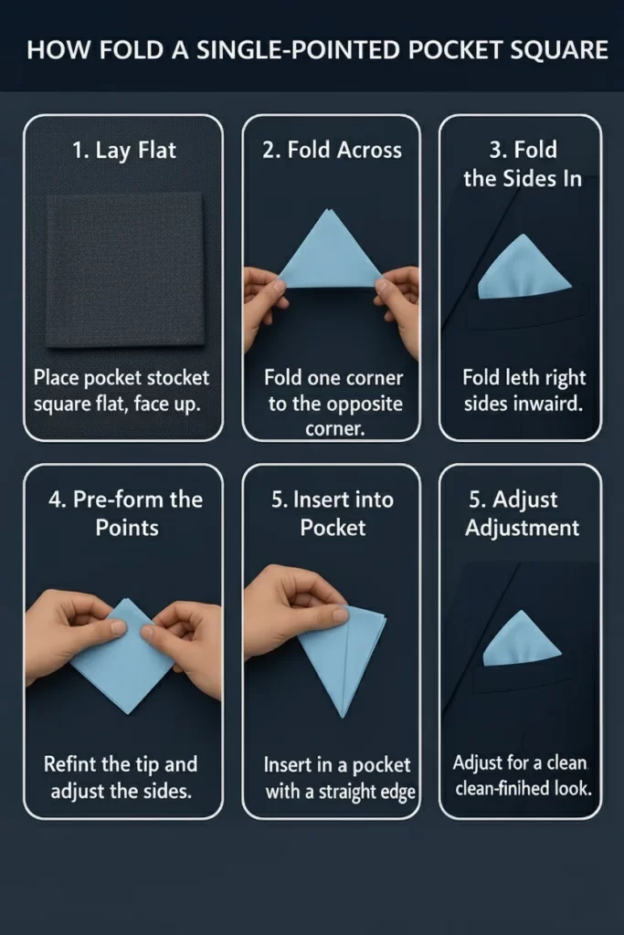 - The Pointed Fold: Diagonally fold the pocket square and then tuck both sides inwards for a neat, pointed shape.