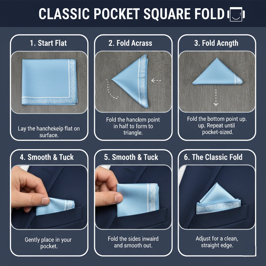 - The Classic Fold: Fold the pocket square diagonally, then fold the bottom up. Clean and classic, this fold is universally adaptable for most occasions.