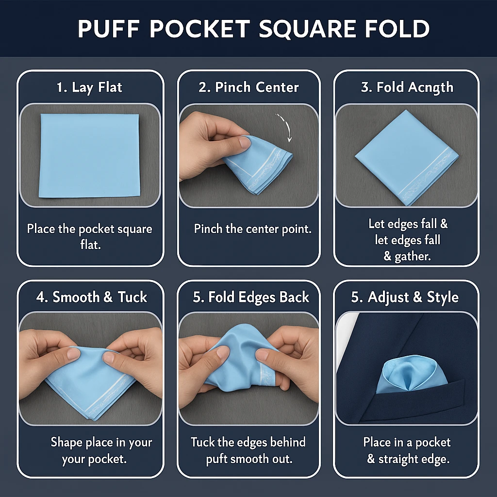 - The Puff Fold: Pinch the middle of the pocket square between your thumb and index finger. Gather the fabric, then fold the edges behind to form a puffed shape.