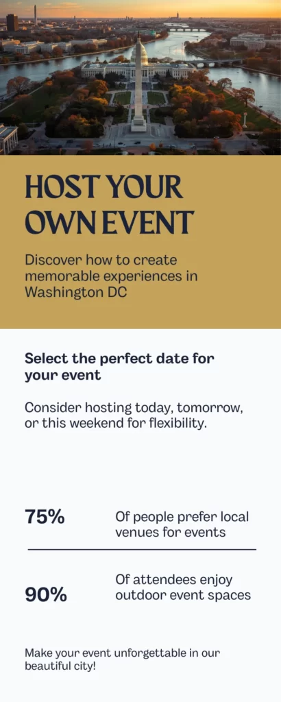 With a variety of DC venues – from luxury hotel ballrooms to trendy rooftop lounges – and plenty of nearby caterers, DJs, and photographers, you can quickly turn that search for “event in DC today” into a successful gathering of your own.