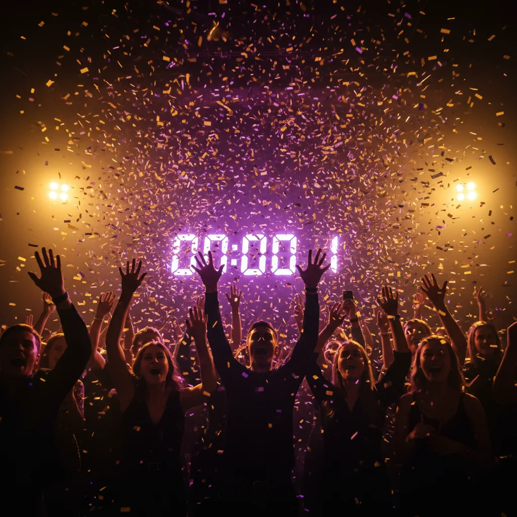 | Midnight | Countdown, champagne toast, confetti or balloon drop |