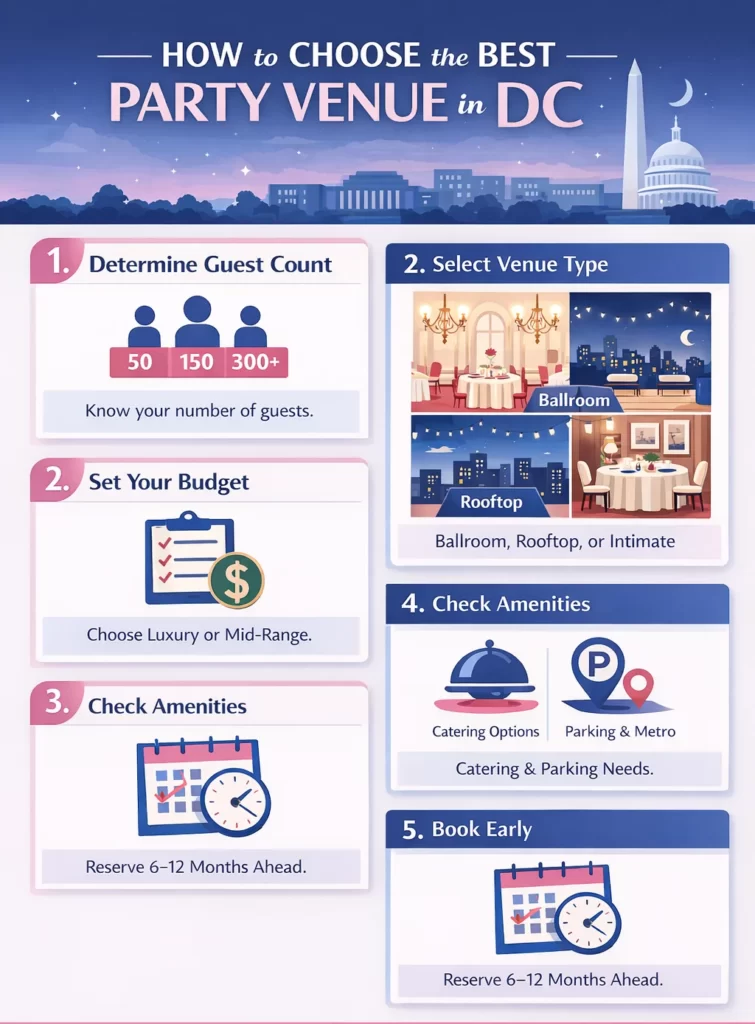 Before booking, confirm your final guest count, preferred venue style (ballroom, rooftop, boutique), catering options, parking and Metro access, and AV requirements. Reviewing these details ensures your party venue aligns with your budget and event goals.