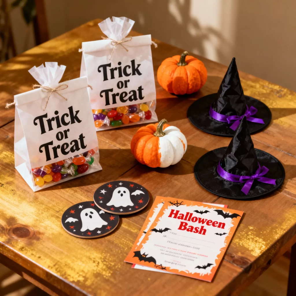 Guests will appreciate memorable favors like personalized candy bags, mini pumpkins, witch hats, spooky coasters, and custom invitations.