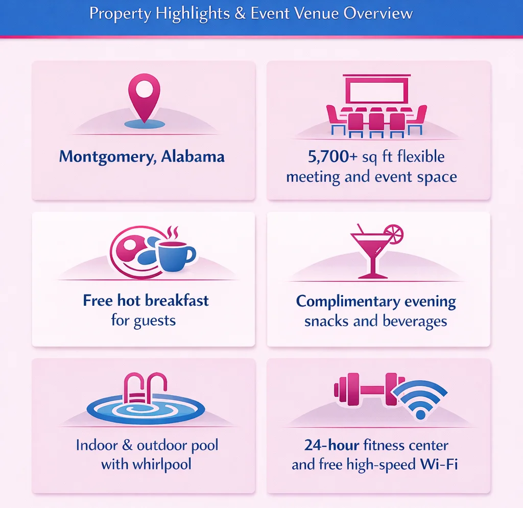 The hotel’s location makes it easy for guests to explore some of Montgomery’s most popular attractions. Visitors can experience cultural landmarks, historical sites, and local universities located nearby.