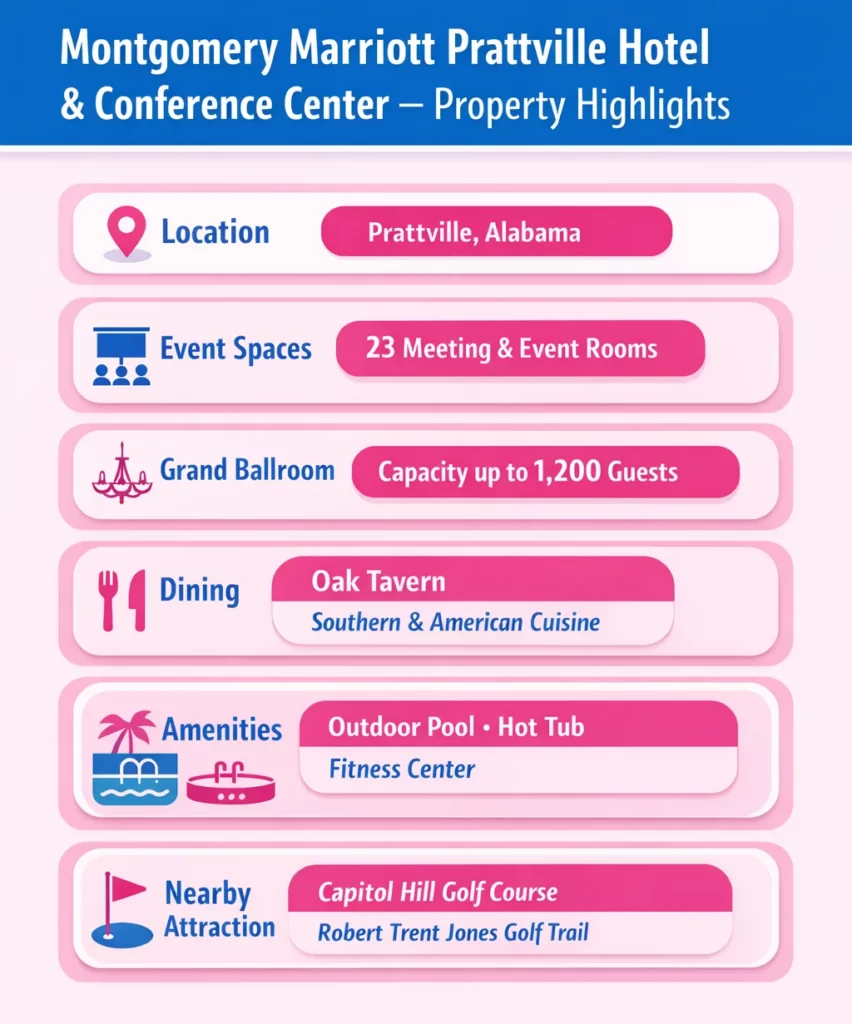 Whether you’re organizing a corporate conference, a formal banquet, or a private celebration, Montgomery Marriott Prattville provides versatile event spaces and professional hospitality services designed to create memorable experiences.