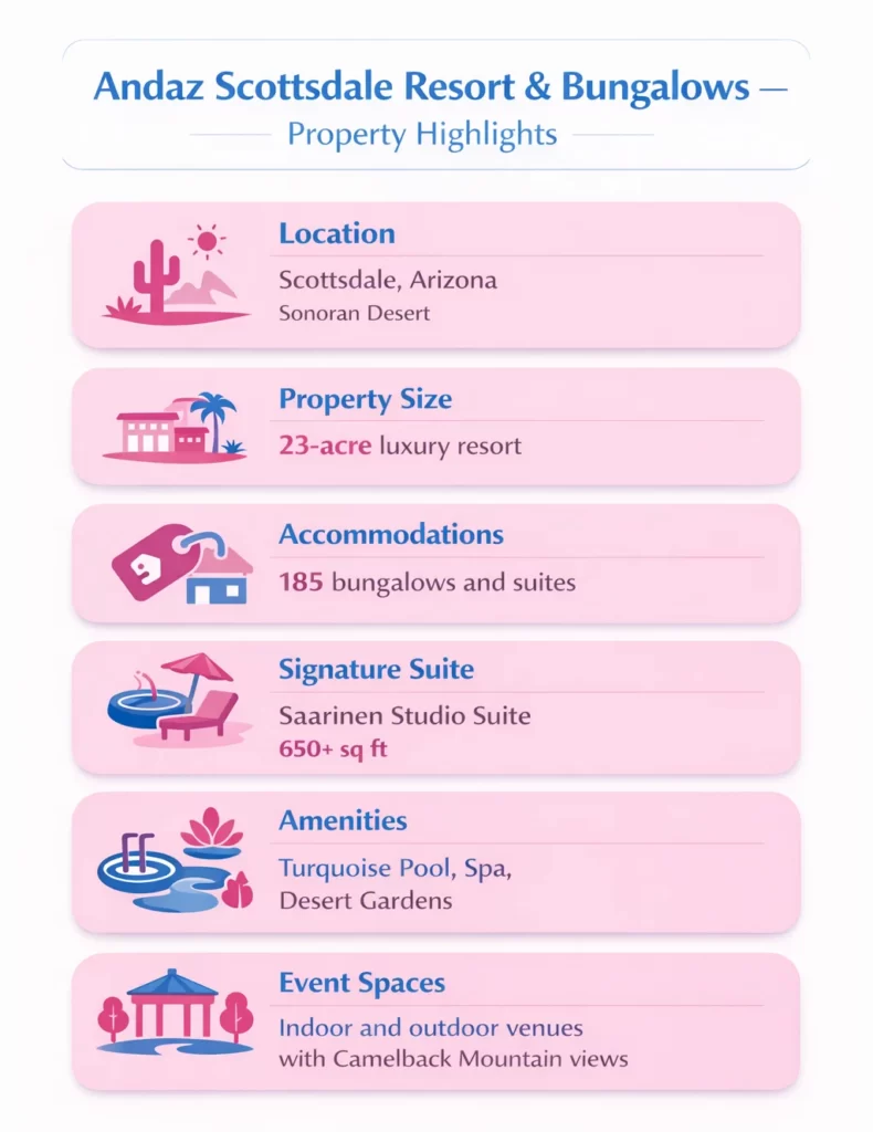 Andaz Scottsdale Resort & Bungalows offers a unique desert oasis featuring mid-century modern design, luxurious accommodations, and scenic outdoor event venues.