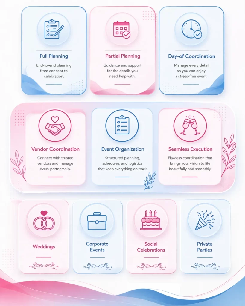 - Day-of Coordination : Manages event-day logistics to ensure smooth execution.