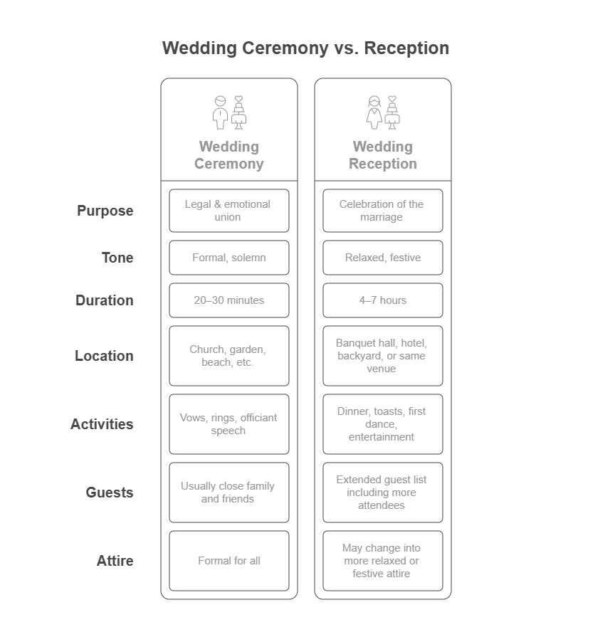 The wedding ceremony is the formal event where the couple gets married. The reception is the celebratory party that follows. Understanding this wedding ceremony vs reception distinction helps with smoother planning.